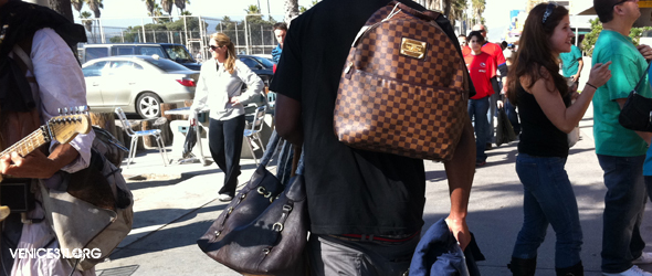 Yesterday LAPD Vice officers arrested two males selling counterfeit Louis Vuitton bags on the boardwalk. The early unseasonably warm weather this year has resulted in a significant increase in foot traffic on the Venice Beach Boardwalk, and illegal vendors are taking advantage.