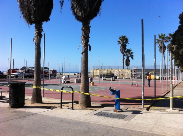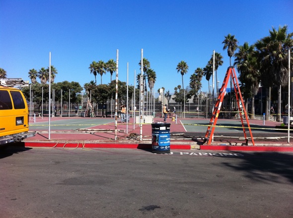 Good news! The heavily used paddle tennis courts in Venice Beach are getting a much needed makeover! The courts themselves are going to be resurfaced and repainted blue and green, and new fences, poles and nets are going to be installed. All the courts will be redone over the next few months. The paddle tennis courts are used a lot each day, especially by LA City Fire Station #63. Looking forward to the new look!